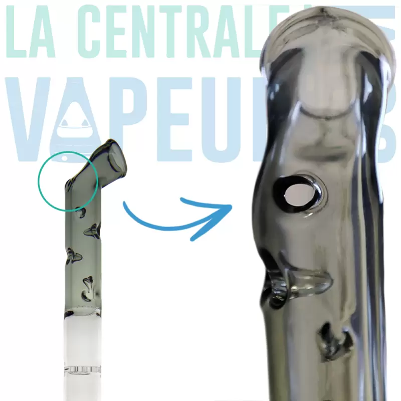Un aérotube en verre fumé pour vaporisateur Arizer ArGo, conçu par Katalyzer. Cinq picots parsèment le chemin de la vapeur afin de la rafraîchir, et un trou d'appel d'air situé sur le dessus permet aisément de gérer la densité de ses bouffées.