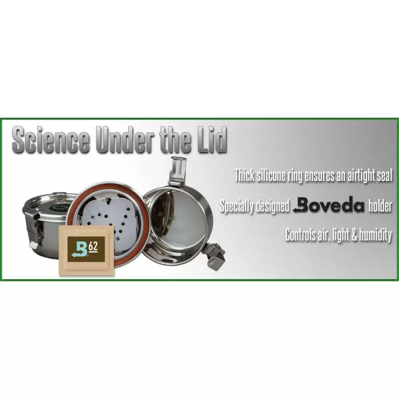 62% humidity thanks to a Boveda pack (not supplied) to be changed every 3-4 months or more. No odor, and much better preservation than TightVac type boxes. No more dust at the bottom of the can. Used by all professionals. Perfect for curing and preserving your plants.